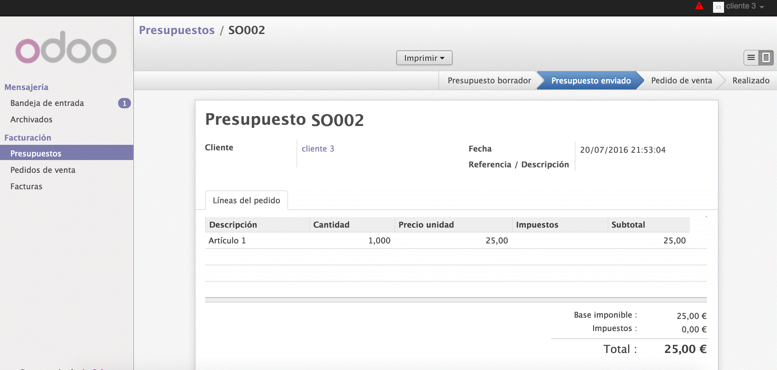 Seguidamente realizamos un presupuesto a un cliente, lo validamos y lo mandamos por correo electrónico.