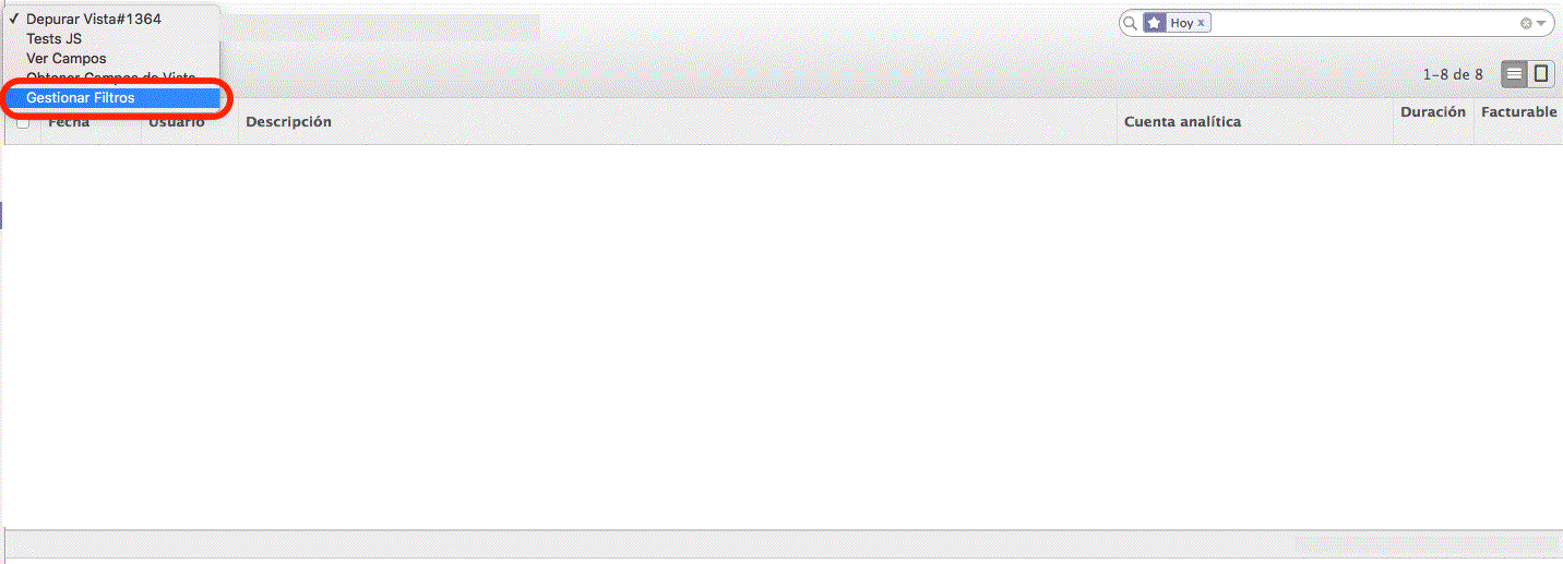 En Modo desarrollador seleccionaremos 'Gestionar filtros' en la vista donde se desee crear el filtro.