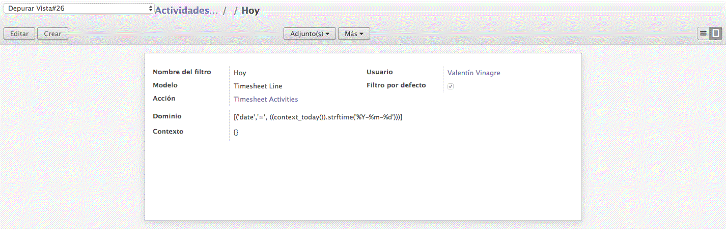 Creamos un filtro nuevo y rellenamos los campos correspondientes al modelo. Si no estamos del todo seguros como deberían ser, siempre podemos crear un filtro desde la vista tree o kanbas, guardar ese filtro, como favorito, y modificar el dominio o copiar los datos de otro filtro que tengamos.