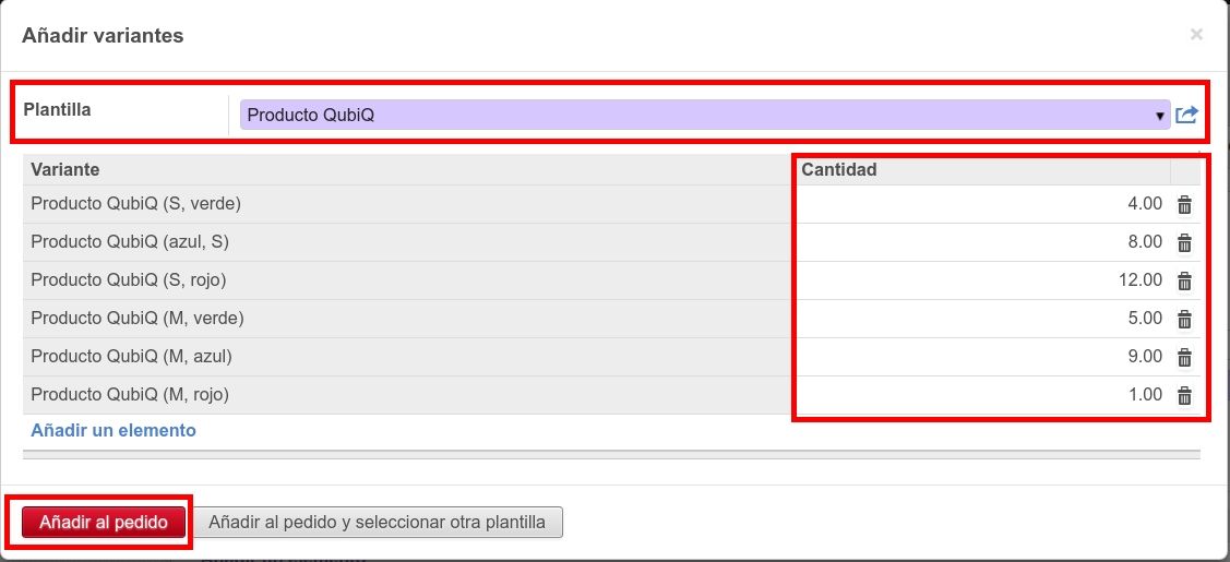 Para crear un pedido, iremos al menú Ventas --> Pedidos de ventas. Cuando queramos añadir las variantes de producto, seleccionaremos el botón de la parte superior izquierda "Añadir variantes" ; esta acción nos abrirá una ventana. En el desplegable "Plantilla", seleccionaremos el producto que queremos añadir en el pedido de venta. Automáticamente, se generarán distintas líneas correspondientes a todas las posibilidades de variantes que nos ofrece el producto en cuestión. Podremos escoger qué cantidad de producto queremos añadir. Una vez finalizado este paso, seleccionaremos "Añadir al pedido" y veremos que se crean las líneas del pedido de venta en función de nuestra selección.