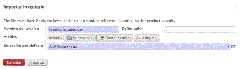 Para realizar la importación del stock actual en Odoo es necesario tener instalado un módulo de la OCA llamado stock_inventory_import, además del módulo de stock de Odoo. No requiere de configuración adicional.