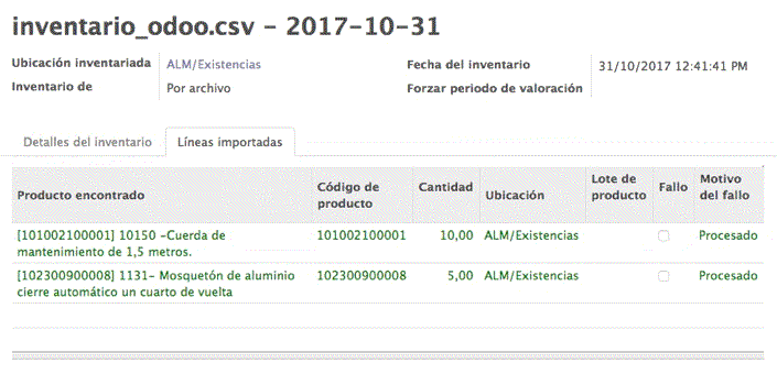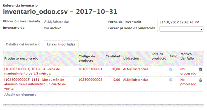 Una vez importado correctamente veremos que hace falta procesar dicha importación. Si, en la vista que nos aparece, accedemos a la pestaña Líneas importadas podremos ver y revisar todas las líneas, el producto asociado y la cantidad que vamos a introducir. Incluso podremos eliminar las que detectemos que se trata de un error presionando el icono con forma de papelera..