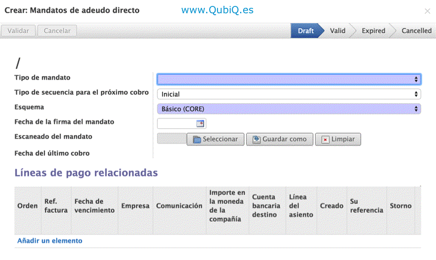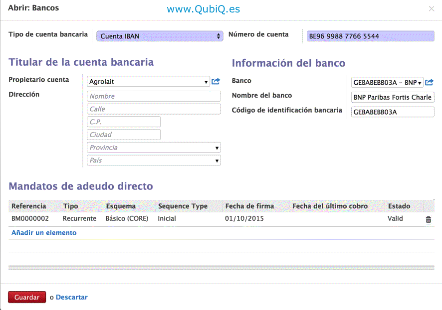 El mandato bancario se une a una cuenta bancaria y representa una autorización que da el titular de la cuenta bancaria a una empresa para una operación específica (por ejemplo, débito directo). Se pueden configurar los mandatos desde el menú contabilidad o directamente desde una cuenta bancaria.