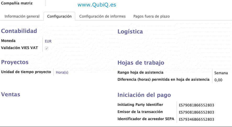 De la misma manera hay que configurar la propia cuenta bancaria. La cuenta bancaria de la empresa emisora. Y obligatoriamente añadir en la ficha de la compañía la identificación del presentador SEPA y el identificador de acreedor SEPA: