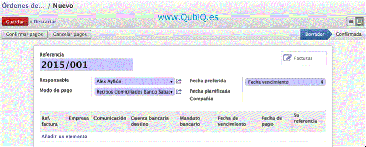 Al guardar, obtendremos una orden de cobro en estado Borrador. Confirmamos entonces la orden de pago.