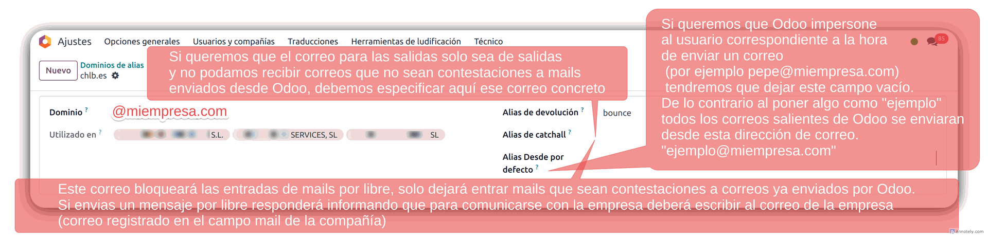 - "Alias desde por defecto": Si queremos que Odoo impersone a los usuarios debemos dejar este campo vac铆o.